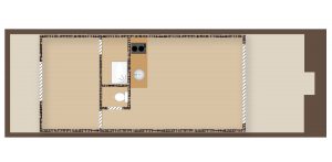 Montez à bord de Fredaine et suivez-nous pour la visite guidée : Vous entrez d’abord dans une pièce à vivre de 18,7m2 (4,8m x 3,9m) où vous pourrez installer votre salon-salle à manger et votre cuisine.
